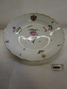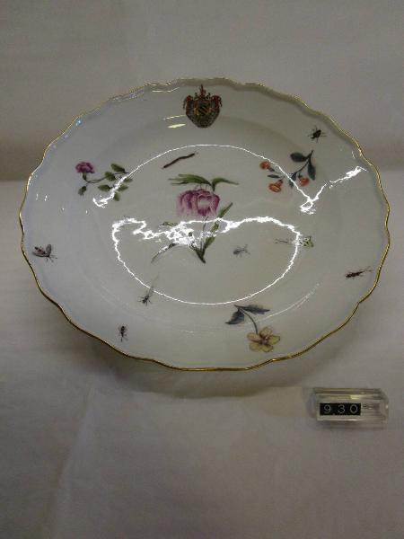 Piatto con orlo centinato e decorato. Decorazione policroma con fiori ed insetti. Il piatto fa parte di un servizio realizzato per il conte Francesco Vincenzo Ferrero, marchese d'Ormea, infatti sulla tesa c'è il suo stemma a bande nere su fondo oro, coronato dal collare dell'Ordine dell'Annunziata, sorretto da due sirene e sormontato dalla corona marchionale.