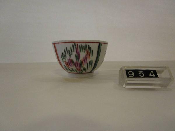 Tazzina da caffè senza manico con decorazione a punto ungheria. Questo motivo decorativo deriva da decori utilizzati sui tessuti negli stessi anni.