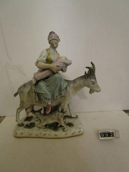 Gruppetto policromo raffigurante una contadina, seduta sopra una capra, mentre allatta il proprio figlio. Sotto l'animale una piccola capra succhia il latte dalla mammella della madre. La base del gruppo è rettangolare con striature in oro.