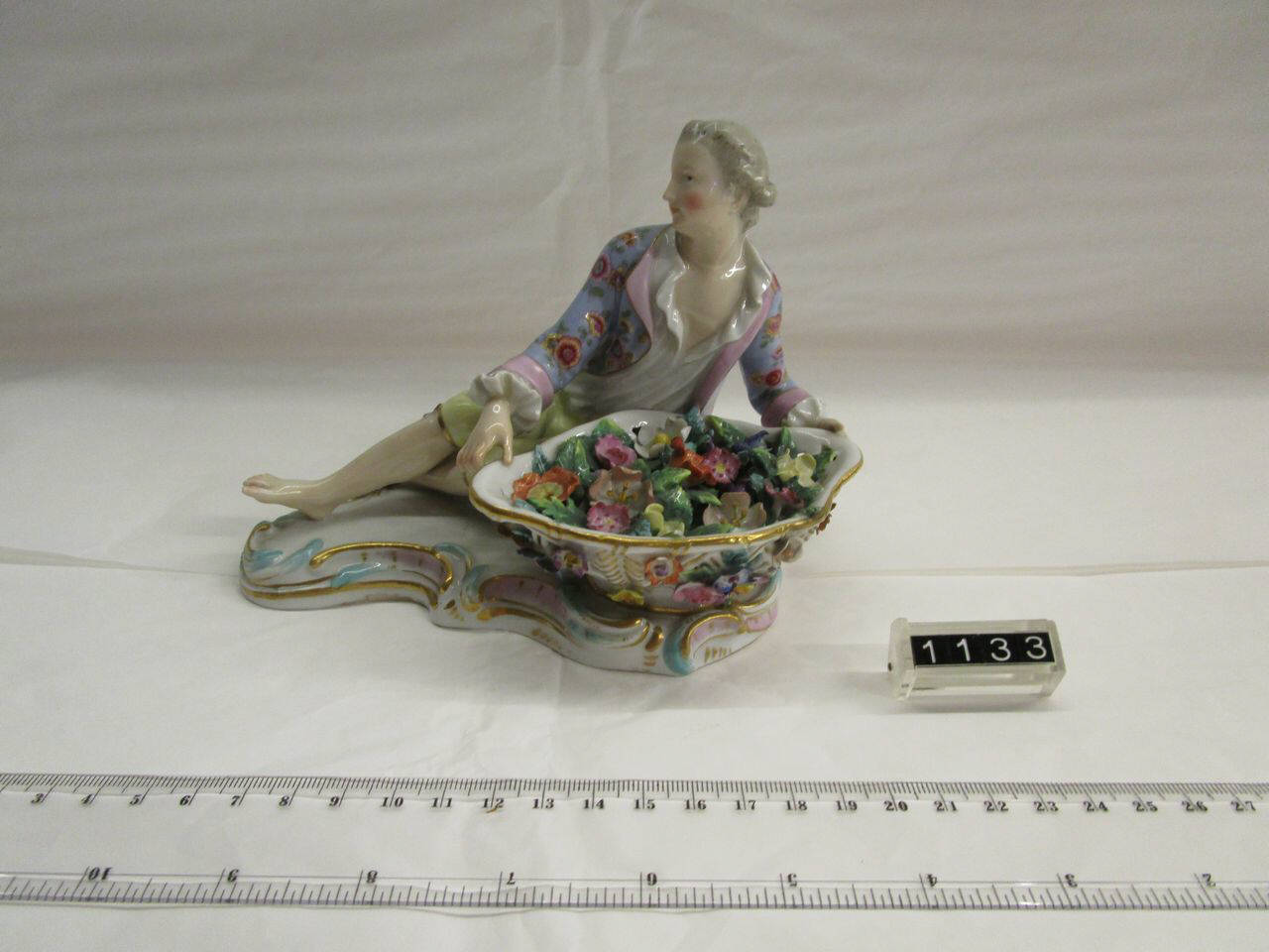 Figura, su base ellittica, a decoro policromo e oro di giovane uomo, sdraiato accanto ad una grande cesta di fiori.
