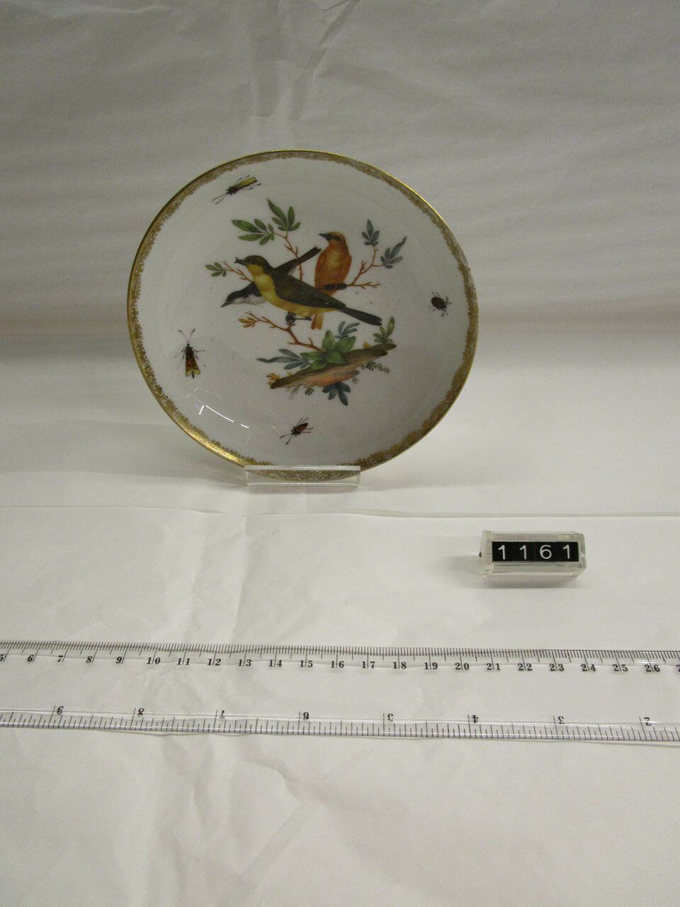 Piattino per tazza inv.1159 a decorazione policroma con uccelli e insetti. Orlo dorato