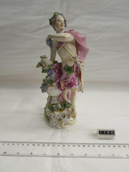 Figura, su base rotonda e a decorazione policroma e oro, raffigurante l'allegoria dell'Autunno. L'uomo è stante, coperto da un drappo rosaceo, tiene nella mano destra una coppa di vino mentre nella mano sinistra un grappolo d'uva; alla sua sinistra un otre di vino.