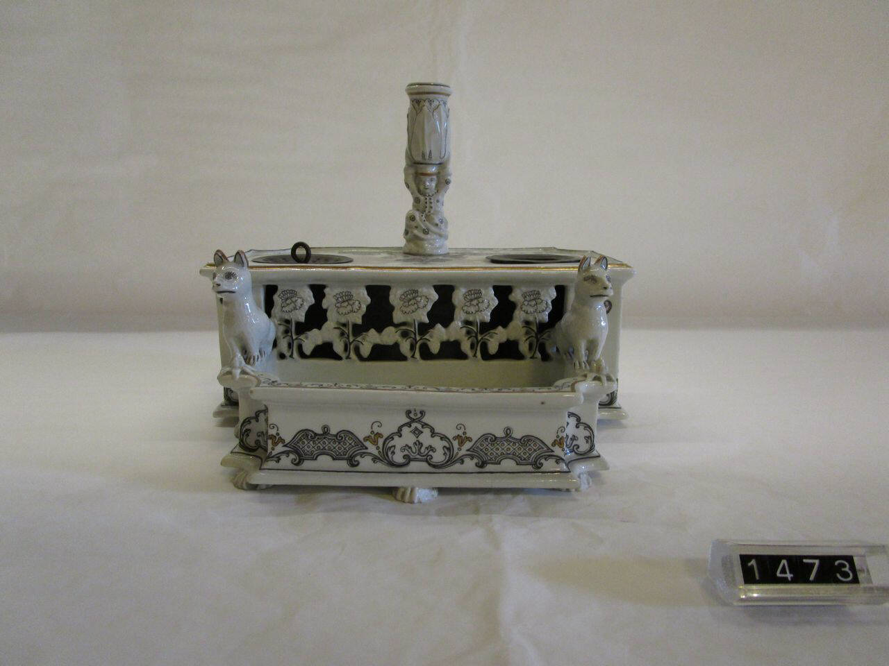 Calamaio rettangolare con vaschetta anteriore ornata di fiere e frontale a crisantemi a traforo; astuccio porta penne sorretto da figura di fanciullo accosciato. Decorazione ornamentale geometrica in nero e oro ad arabeschi. Questo calamaio è un tipico esempio di unione di motivi ornamentali europei con altri orientali, si veda ad esempio i cani decorativi agli angoli e il candeliere con forma cinese.Il pezzo è passato dalla collezione della Cina a quella delle porcellane il 26 febbraio 2008.