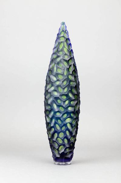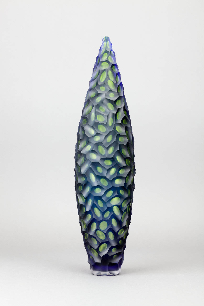 Elemento verticale di colore blu a forma di punta di lancia, di fuso. Su tutta la superficie sono presenti sfaccettature ribassate, che presentano all'interno una forma ellissoidale verde chiaro.