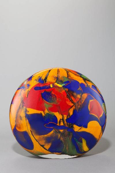 Elemento a forma di disco lenticolare. Decorazione astratta a macchie e forme diverse rosse, blu e verdi su fondo giallo.