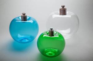 Composizione costituita da tre sfere di vetro soffiato (una incolore, una azzurra e una verde), ognuna presenta una zona depressa alla sommità entro la quale è alloggiato un peso metallico di quelli utilizzati comunemente nelle bilance a due piatti.