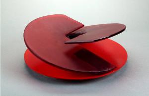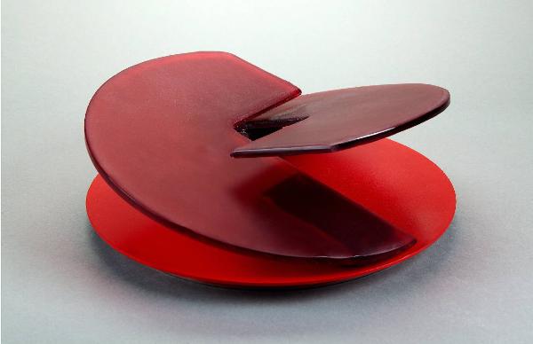 Su un disco di acciaio color rosso sono appoggiate due figure geometriche realizzate in vetro rosso ricavate da due porzioni di diso a "L" che si incastrano tra loro.