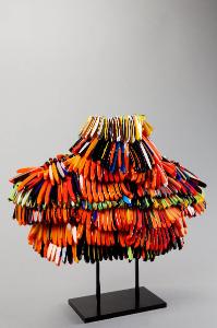 Bastoncini di vetro policromi, ma con una preponderanza di color arancione, infilati in sequenza e sovrapposti in otto file come una sorta di mantello a piume.