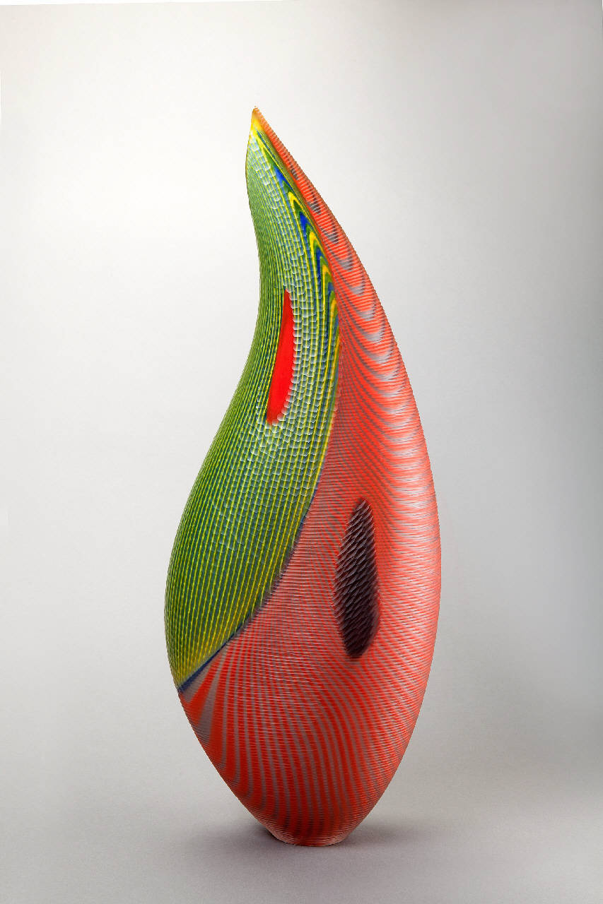 Elemento a forma di una virgola rovesciata decorata da un reticolo, per circa metà della superfice, a righe verde/blu e per l'altra metà a righe rosso/grigie.