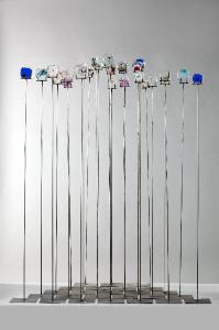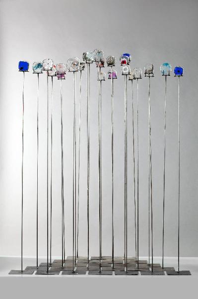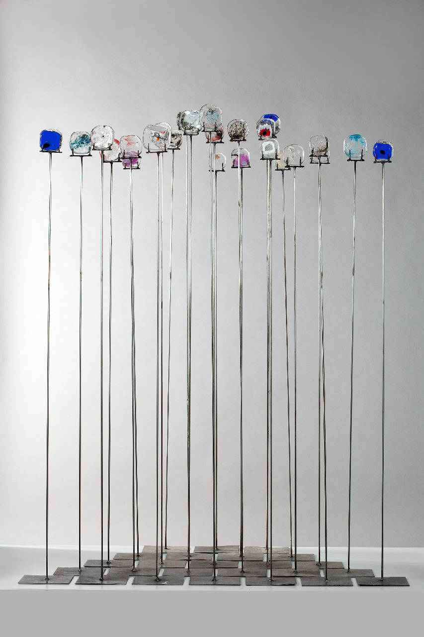 Composizione costituita da 25 elementi: su una base in ferro quadrata si erge un lungo stelo in ferro sulla cui sommità è fissata una piastra di forma quadrata irregolare in vetro con elementi colorati inclusi. Ogni piastra è differente dalle altre.