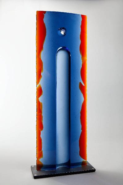 Su una base rettangolare in metallo è fissata una lastra rettangolare in vetro con insenatura curvilinea al centro e foro nella parte superiore. Vetro blu nelle parte centrale e rosso fiammato ai lati.
