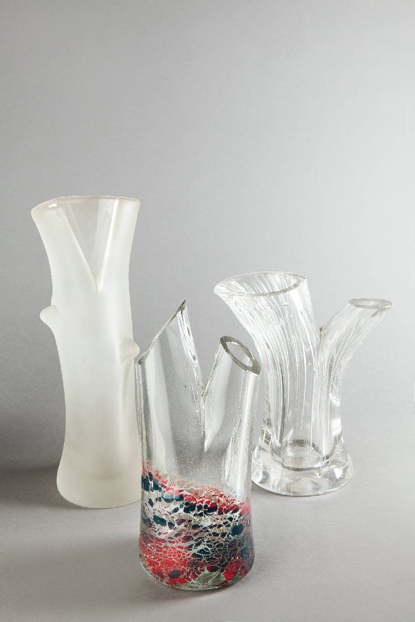 Vaso di vetro incolore satinato a forma di frammento di tronco d'albero, tagliato nella parte superiore, termina con una apertura che costituisce una bocca del vaso.