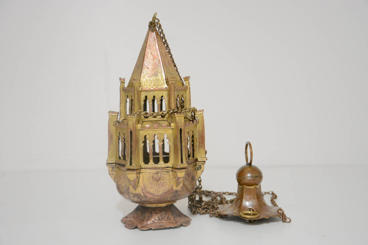 Turibolo architettonico a sezione esagonale. Piede con clipei con raffigurazioni zoomorfe stilizzate. Il corpo è ornato da lunette rovesciate con al centro un fiore stilizzato. Coperchio a due ordini con trifore alternate a contrafforti turriti. Sommità cuspidata con motivi vegetali incisi.