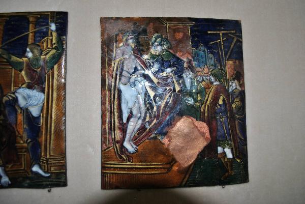 - NOTIZIE STORICO CRITICHE La placchetta in esame fa parte di una serie di dodici placchette con scene della Passione di Cristo. L'autore limosino si è ispirato alle xilografie della Passione di Albrecht Durer pbblicate tra il 1497 e il 1511. Sulla didascalia dell'opera è proposta, in modo dubitativo, l'attribuzione al Maestro del polittico di Mesnil-sous-Jumièges.