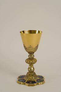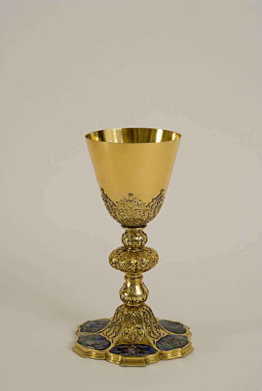 Piede esalobato, con gradino modanato, suddiviso in sei specchiature ornate da motivi decorativi vegetali intrecciati a terminazioni gigliate e con medaglioni in smalto dipinto raffiguranti Storie della Vergine (Nascita di Maria, Annunciazione, Visitazione, Natività, Circoncisione, Assunzione della Vergine). Innesto del fusto piriforme, nodo a cipolla schiacciata con motivi decorativi a intreccio. Sottocoppa con motivi decorativi a voluta con terminazioni gigliate traforati.