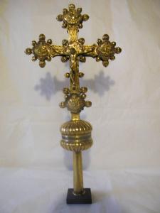 Croce astile in lamina di rame dorato su anima in legno. Recto: Cristo crocifisso al centro e alle estremità dei bracci, entro formelle quadrilobate, i busti dei Quattro Evangelisti. Verso: Dio Padre benedicente al centro e alle estremità dei bracci la Madonna, San Giovanni Evangelista, Santa Maria Maddalena e in alto il pellicano. Nod0 a doppia valva baccellato suddiviso da una fascia con la scritta dedicatoria a niello.