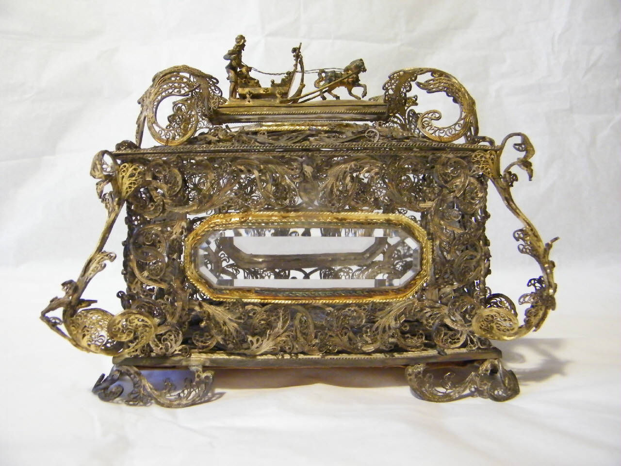 Urna in filigrana d'argento a parallelepipedo poggiante du piedini a doppia voluta in filigrana. Specchiature ottagonali in cristallo di rocca sui lati e ampi motivi a voluta negli angoli e sul coperchio ornato al centro da una slitta, a fusione, trainata di un cavallo, guidata da un uomo in piedi e con una donna seduta.