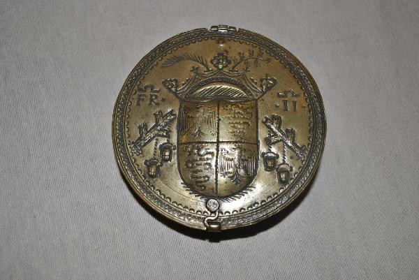 Teca formata da due valve incernierate. Sul fronte del coperchio è sbalzato e inciso lo stemma sforzesco, sormontato dalla corona ducale con rami di palma e olivo; ai lati è incisa l'impresa delle secchie e dei tizzoni, con la scritta FR II. Bordo ornato da una doppia linea e da cerchi incisi. All'esterno, sul fondo, è rappresentata una colombina con cartiglio sotto le zampe con la scritta AVE MARIA.