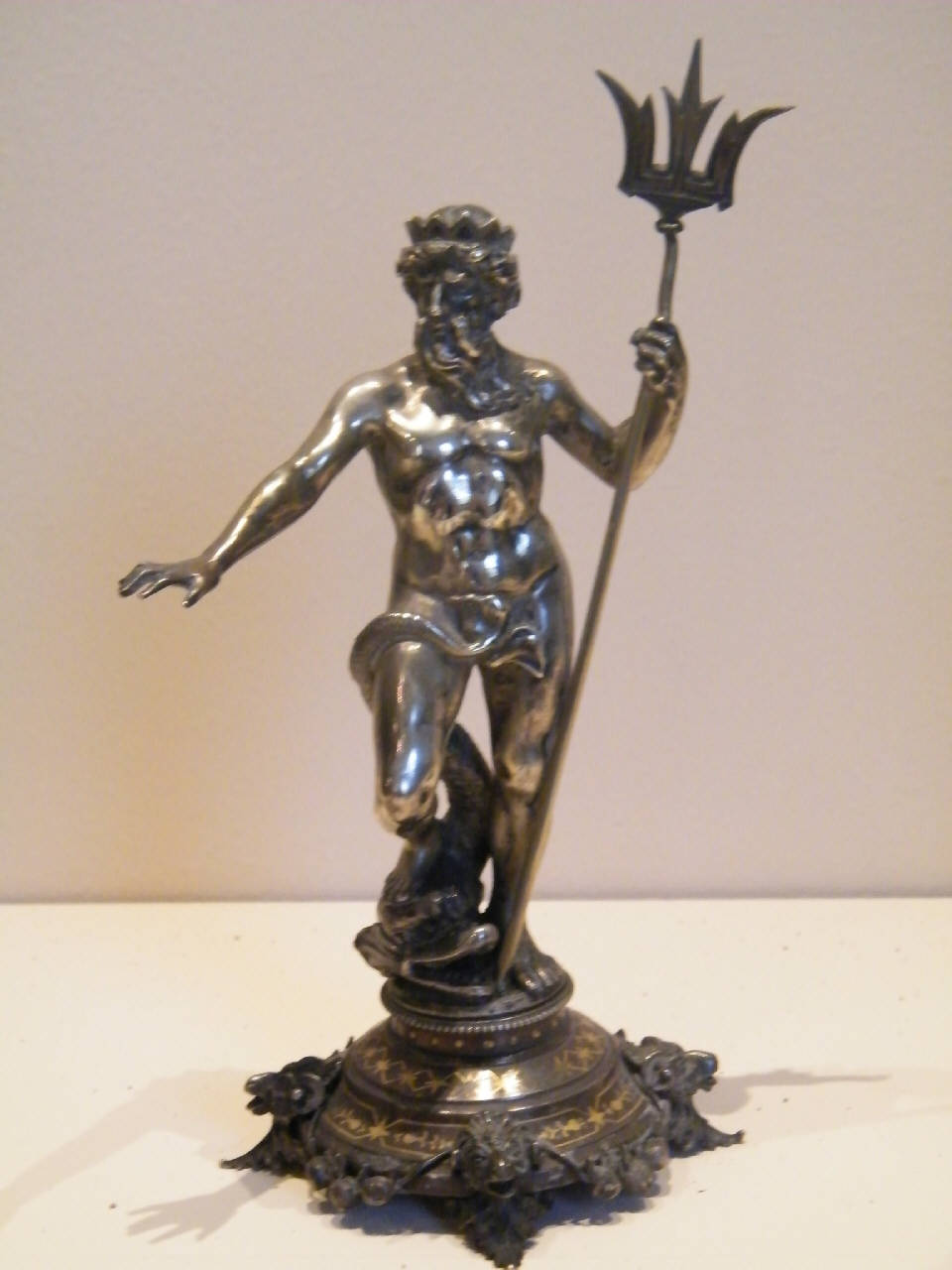 Statuetta di Nettuno con tridente e delfino su una base circolare su piedini a testa di caprone raccordati da festoni di frutta con decorazioni dorate.