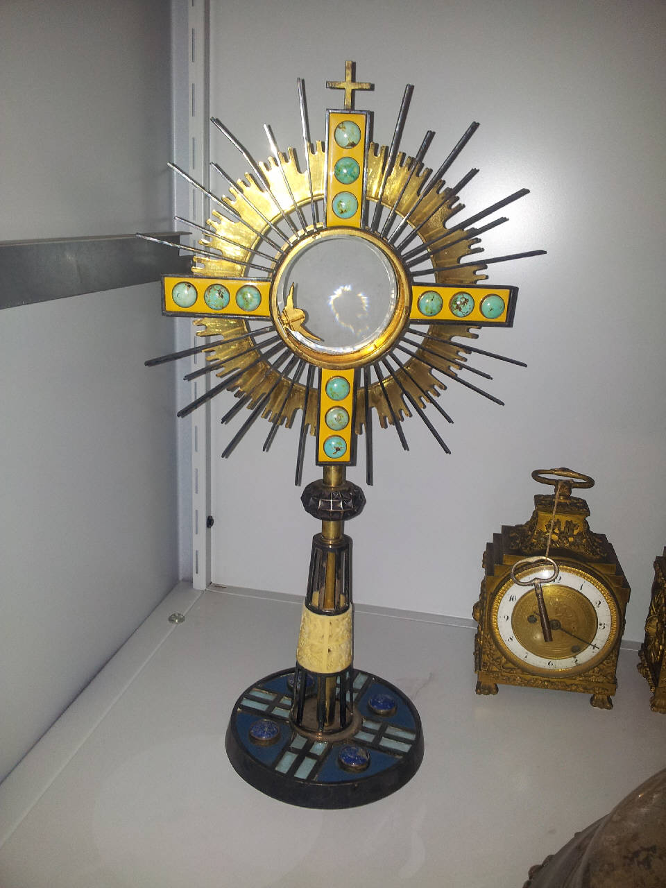 ostensorio in argento parzialmente dorato. Il piede circolare è decorato da smalti e quattro lapislazzuli lavorati a cabochon. Il fusto è ornato con una fascia in avorio con decorazioni fitomorfe e le quattro raffigurazioni apocalittiche degli Evangelisti; la teca circolare è circondata da una stilizzata raggiera ornata da quattro terne di turchesi pure lavorati a cabochon.