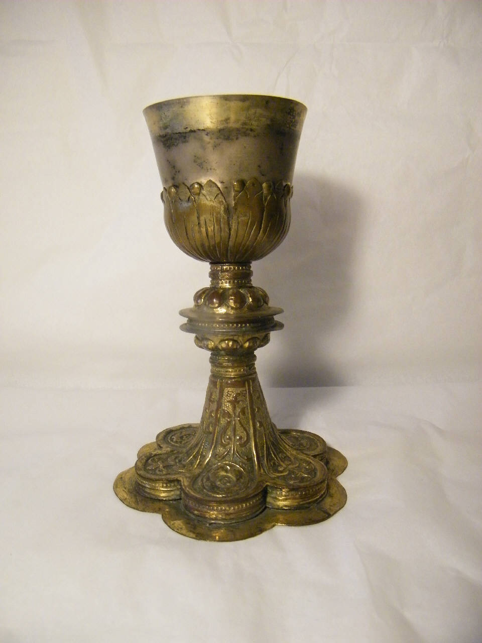 calice in rame dorato con piede esalobato con alto zoccolo, decorazioni a girali vegetali e fondo inciso a punzone. La coppa ha l'orlo svasato e sottocoppa a fogliami; l'interno è completamente dorato.
