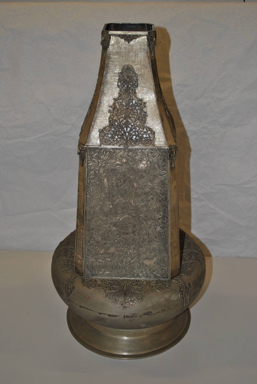 centro tavola a forma di vaso con base a bulbo depresso e parte soprastante a tronco di piramide. Il corpo è ornato da racemi, foglie, fiori, uccelli, arabeschi.