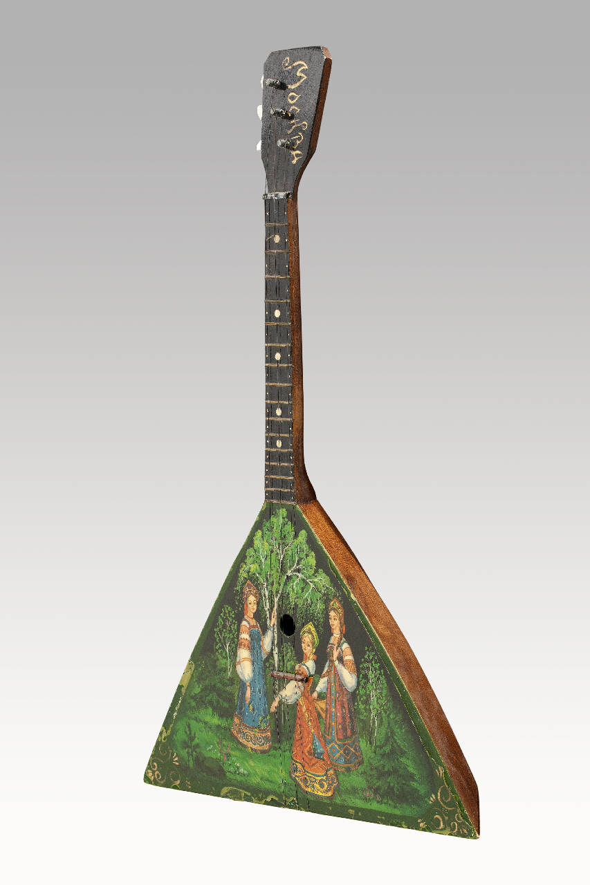 La balalaika ha cassa a base svasata e tavola armonica triangolare decorata con rappresentazione silvestre con tre figure femminili in abiti tradizionali; tre piroli.\nLa decorazione dipinta sulla tavola armonica denuncia la destinazione come oggetto decorativo destinato al mercato turistico