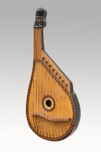 Bandura ucraina a pizzico (uno strumento a corde del salterio) con cassa armonica piatta dal profilo ovale che si estende su un lato a formare un corto manico con cavigliere. Quest'ultimo sostiene tre caviglie metalliche infisse che tendono altrettante corde. Sul profilo superiore della cassa sono infisse altre caviglie dello stesso tipo per otto corde. Tutte le corde sono ancorate sulla fascia inferiore e passano al di sopra di un lungo ponte a esse.\nSi tratta di una riproduzione in scala ridotta ad uso turistico.