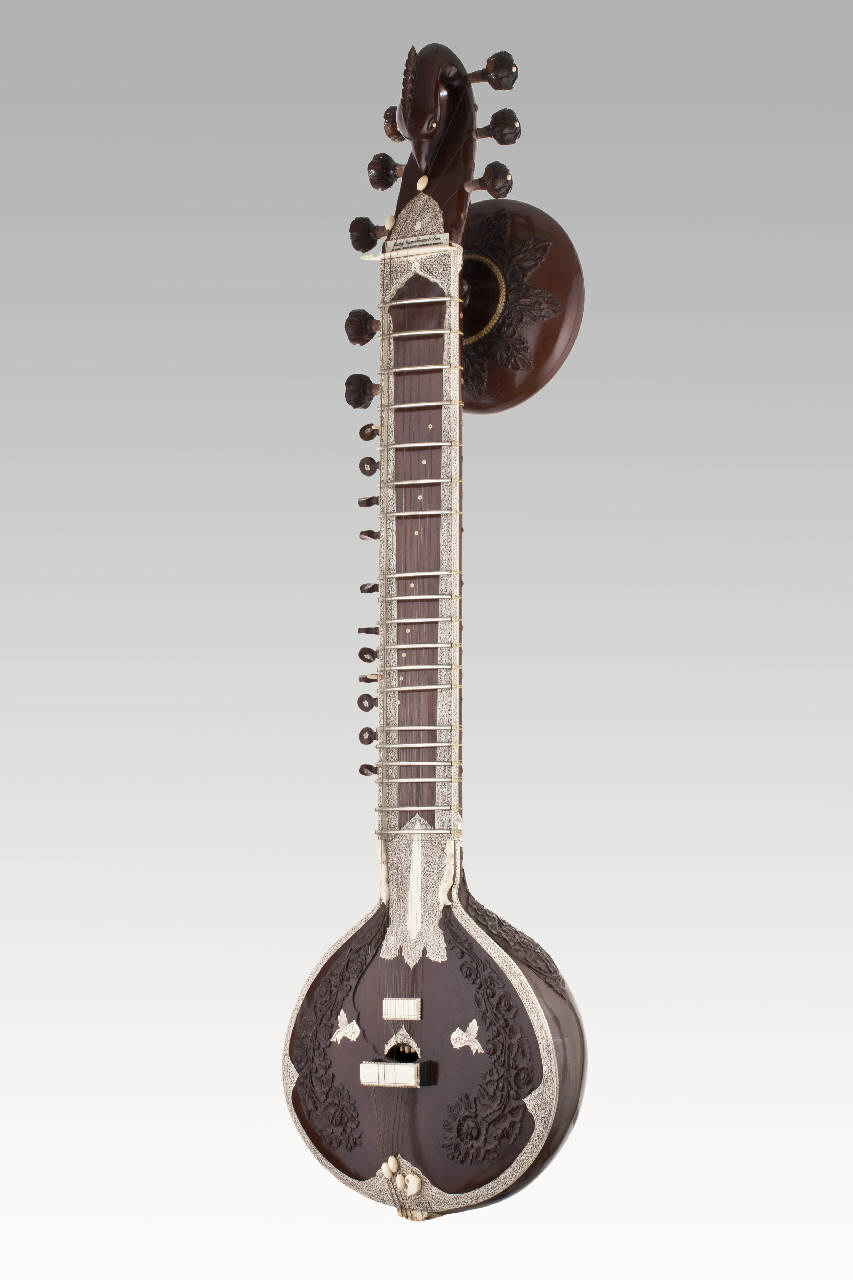 Surbhar (sitar basso) hindustanico a manico lungo con cassa armonica ricavata da una zucca; la zona di raccordo tra la cassa e il manico è decorata ad intaglio con fiori e foglie; un secondo risuonatore è applicato nella parte superiore del manico ed è in legno tornito; cavigliere incurvato in avanti a forma di testa di cigno e con sei piroli laterali; due grossi piroli laterali sul manico e undici piroli piccoli sulla tastiera, cordiera in avorio; i tasti sono ricavati da barrette metalliche incurvate che poggiano sui bordi della tastiera incavata.