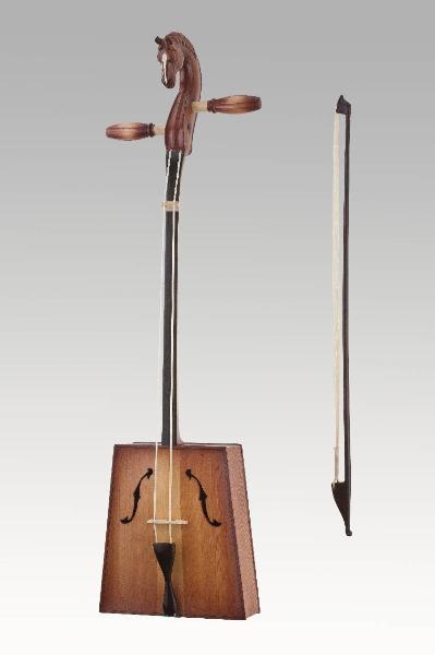 Morin Khuur mongola a manico lungo (liuto ad arco) con cassa di forma trapezoidale e piatta; cavigliere incurvato in avanti a forma di testa di cavallo con due bischeri, tavola armonica in legno con due fori ad S; archetto non arcuato con il crine lasco.