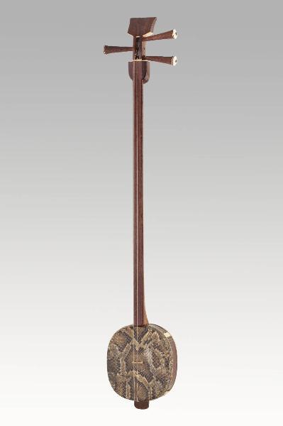 Sanxian cinese con lungo manico e cassa armonica piccola, cornice ovoidale di palissandro sulle cui facce sono incollate due membrane di pelle di pitone; Il manico attraversa la cassa terminando con un blocco di legno su cui si ancorano le corde. Tre caviglie troncoconiche: due da un lato e una dall'altro; capotasto di osso nel cavigliere.