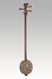 - NOTIZIE STORICO CRITICHE Luogo d'uso: Cina\nIl sanxian è il principale liuto tradizionale cinese a manico lungo. Il nome significa "a tre corde". Come è avvenuto per molti altri strumenti cinesi, esso si è diffuso nelle aree geografiche vicine, dando vita nelle culture musicali della Corea, dell'Indocina e del Giappone a strumenti analoghi; in particolare in Giappone il sanxian è penetrato alla fine del XVI secolo attraverso Okinawa; qui fu recepito con il nome jahisen, che significa "corda - pelle di serpente", avviando il processo che portò a generare il liuto a manico lungo denominato shamisen, che invece significa anch'esso "a tre corde": sembra evidente che, come spesso avviene con i nomi degli strumenti musicali, le denominazioni abbiano compiuto un percorso relativamente autonomo di sovrapposizione di significati, con intrecci tra le due lingue, e di riferimenti morfologico-descrittivi (per lo shamisen si vedano gli strumenti in collezione con i numeri di inventario 438, 439, 440, 441). In Giappone comunque il sanxian / jahisen è rimasto in uso nella primitiva forma, con la quale è stato anche costruito, come strumento del repertorio vocale e strumentale mishingaku, vale a dire "musica [cinese delle dinastie] Ming e Qing'", adottato in Giappone in ambiente urbano, soprattutto a Nagasaki, nel periodo Edo (XVII-XIX sec.). Le radici storiche dello strumento cinese non sono facilmente documentabili, tuttavia alcuni importanti indizi suggeriscono un'origine da occidente a partire da liuti lunghi di matrice islamica: non ultimo, tra gli indizi, è il nome, che ripete la denominazione, espressa ovviamente in altre lingue, in primo luogo il persiano, basata sull'impianto a "tre corde". L'impianto "a spiedo" è peraltro più antico, comunque diverso da quello a collo di gran parte dei liuti lunghi a tre corde persiani, arabi, turchi o centro-asiatici. Comune ai due gruppi di strumenti (quelli estremo-orientali e quelli islamici) è l'escursione delle corde oltre il ponticello e attraverso l'intera cassa, sino all'ancoraggio disposto o sul fondo di quest'ultima o sul puntale sporgente. Tale disposizione delle corde rinvia alla struttura a manico passante ("a spiedo") come probabile matrice comune, ma è anche la più adatta per sorreggere corde metalliche. Le corde del sanxian / jahisen e dello shamisen sono invece di seta e pertanto pongono minori problemi di tensione e di aggressione a materiali cedevoli come il legno e la pelle animale.\nIl sanxian è usato prevalentemente per l'accompagnamento del canto, in particolare di quello narrativo. La sua voce è particolarmente potente, e perciò esso ben si adatta a suonare in complessi strumentali. L'accordatura è basata su una quinta e un'ottava (una quarta tra la corda intermedia e quella più acuta: Sol, re, sol). Per adattarsi al registro vocale del cantante può essere adottato un capotasto mobile che modifica la lunghezza del tratto vibrante delle corde. L'estensione è di tre ottave e mezzo. Il ponticello poggia sul piano armonico in prossimità del bordo inferiore. Le corde vengono pizzicate per mezzo di plettri ad anello infilati sul pollice e l'indice della mano destra, ma è previsto anche l'uso senza plettri. (Guizzi, 2001)\n\nForma originata durante la dinastia Han. (Mazzeo, 2020)