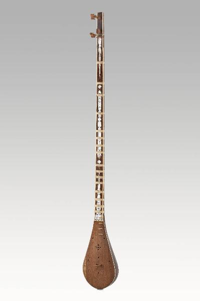 Dutar a manico lungo con cassa piriforme scavata in un unico pezzo di legno; tavola armonica con undici piccoli fori di risonanza disposti simmetricamente ed intagliati in modo obliquo; manico lungo e stretto su cui sono annodate 16 tastature mobili di legacci di filo di nylon. Quattro ulteriori tasti fissi di legno sono incollati nella zona di raccordo tra il manico e la cassa e sulla tavola. L'estremità prossimale del manico funge da cavigliere nel quale sono infissi due piroli frontali e due laterali; manico intarsiato in madreperla con cerchi, quadrati cunei ellissi; cassa armonica decorata sul retro con un motivo intagliato costituito da due pavoni contrapposti separati da un recipiente modanato contenente vegetali stilizzati.