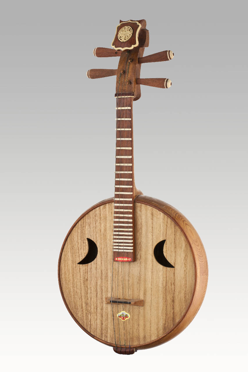 - NOTIZIE STORICO CRITICHE Si tratta della versione modernizzata del principale liuto a manico corto a collo della musica tradizionale cinese con cassa "a chitarra", vale a dire costituita da tavole assemblate e non da un blocco di legno scavato per ricavarne un guscio. Il nome si può tradurre come "strumento a corde a forma di luna", a causa evidentemente della perfetta circolarità della cassa armonica. L'altro carattere morfologico tipico dello Yueqin è costituito dal manico, particolarmente corto, che in questo caso ha subito la modifica più vistosa consistente in una estensione di più del doppio di quello originario. All'interno della cassa dovrebbe essere presente un dispositivo timbrico costituito da una barretta metallica avvolta a spirale e capace di entrare in vibrazione in rapporto con la vibrazione principale delle corde. In realtà non è stato possibile verificare la presenza effettiva di tale elemento nell'esemplare in collezione. Le due coppie di corde sono accordate a distanza di quinta e si suonano con il plettro. Lo strumento è appoggiato in posizione leggermente diagonale alla coscia sinistra del suonatore.