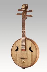 Yueqin [YÜEH - CH' IN] (liuto a pizzico cinese) Con cassa armonica circolare e piatta, fondo in legno chiaro; due fori di risonanza a forma di mezzaluna; la fascia, leggermente bombata, è costituita da sei segmenti di legno scuro incollate l'una all'altra; cavigliere leggermente incurvato in avanti a V, regge quattro piroli laterali; la tastiera si estende dal capotasto lungo tutto il manico fino a circa metà della tavola armonica. Le tastature sono relativamente larghe, pur essendo modellate sulle barrette metalliche della chitarra occidentale. Detto anche chitarra luna cinese.