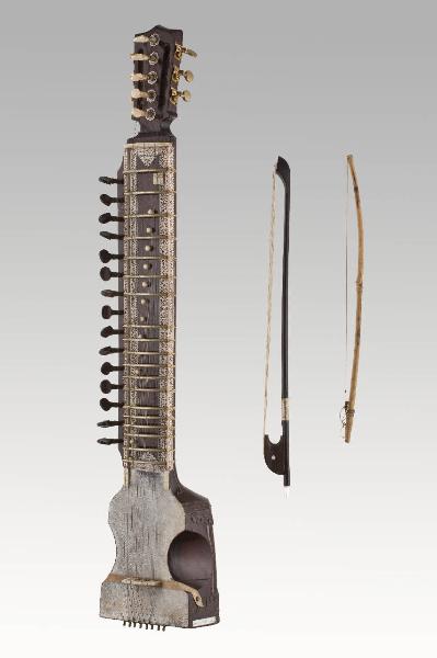 Dilruba hindustano a manico lungo con cassa armonica simile a quella del sarangi "classico", quindi di forma squadrata con due anse asimmetriche lungo i fianchi. Piano armonico in pelle; cavigliere a paletta, " a chitarra", con meccaniche a vite senza fine; a centro della paletta stessa sono infisse cinque caviglie allineate verticalmente. Manico largo incavato nella parte anteriore sopra la quale sono disposti tasti metallici arcuati. Capotasto in osso con sei tacche e cinque fori; capotasto piccolo sulla tastiera per le corde di simpatia tese dalle caviglie centrali della paletta. Sul lato destro è applicata un'appendice che sostiene le caviglie delle corde di simpatia, le quali passano al di sotto dei tasti arcuati; ponticello a M in avorio poggiato su una fascia di rinforzo di cuoio; sul manico diciannove tasti arcuati in peltro, bordo in celluloide e con decorazioni bianche e rosse e nere; nel fodero dello strumento c'è in dotazione un pezzo di pelle conciata. Custodia nera. Archetto rigido con tallone sagomato.