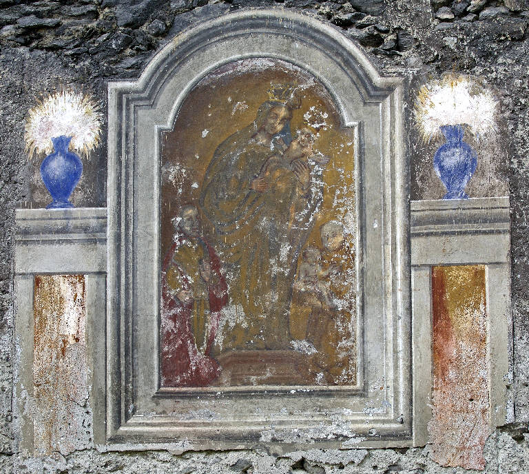 - NOTIZIE STORICO CRITICHE L'affresco, collocato sul prospetto di un edificio dell'antico nucleo della contrada Cagnoletti, era costituito inizialmente dalla sola parte centrale. Negli anni Settanta del Novecento furono aggiunte le parti laterali con i vasi di fiori. Inoltre, va rilevato che la Madonna e Gesù Bambino riprendono le fattezze e le attitudini della statua della Madonna conservata nel Santuario della Beata Vergine della Grazie a Primolo, scolpita da Giovan Battista Zotti e solennemente incoronata l¿11 agosto 1765 per decreto del Capitolo di San Pietro in Vaticano.