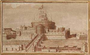 Dipinto a monocromo raffigurante Castel Sant'Angelo e del Ponte degli Angeli a Roma.