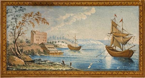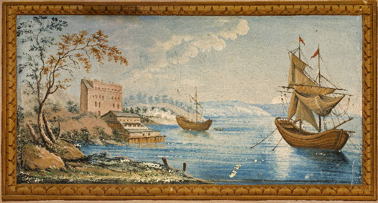 Due velieri solcano le acque calme del lago, sul quale si affacciano alcune costruzioni, a sinistra. Sullo sfondo si vede il profilo arrotondato di basse montagne.