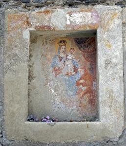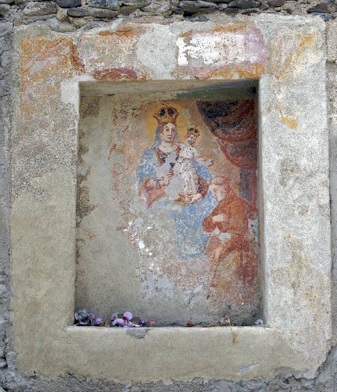 Una tenda, sulla destra, svela l'immagine della Madonna con Gesù Bambino che SI volge in basso, a destra, verso un santo francescano. Esternamente la nicchia è incorniciata da motivi decorativi in finto marmo e presenta, in alto, un'iscrizione assai lacunosa.
