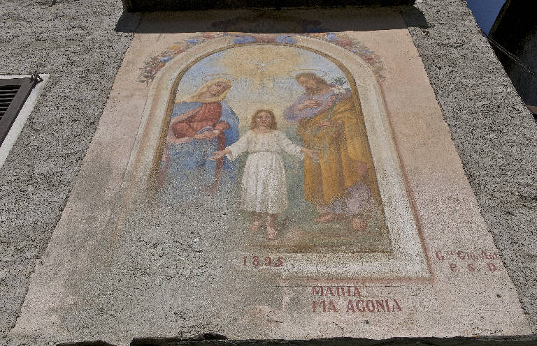 In una specchiatura centinata, con una conchiglia e fiori alla sommità, sono rappresentati la Madonna, Gesù e San Giuseppe, in piedi, uno accanto all'altro; al di sopra sta la colomba dello Spirito santo.