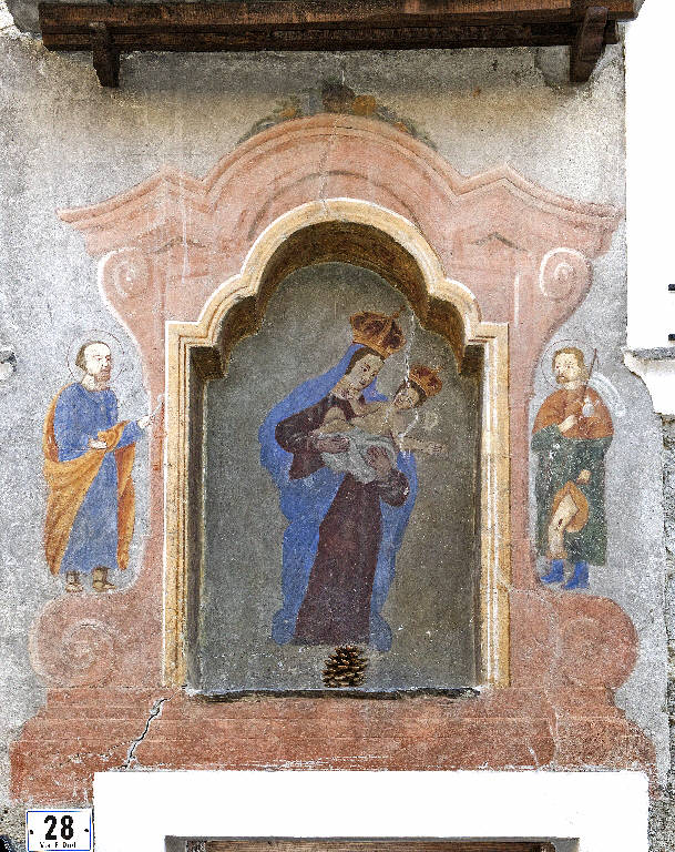 - NOTIZIE STORICO CRITICHE La Madonna e Gesù Bambino riprendono le fattezze e le attitudini della statua della Madonna conservata nel Santuario della Beata Vergine della Grazie a Primolo, scolpita da Giovan Battista Zotti e solennemente incoronata l¿11 agosto 1765 per decreto del Capitolo di San Pietro in Vaticano. A partire da questa data il culto per la Madonna Madonna di Primolo si intensificò in tutta la valle, come è testimoniato dal dipinto murale in esame.
