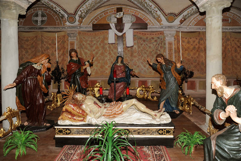 - NOTIZIE STORICO CRITICHE Il gruppo del Compianto sul Cristo morto è assegnabile su base documentaria e stilistica alla bottega dei Fantoni, una famiglia di scultori e intagliatori di Rovetta, che fra il 1680 e il 1780 ebbe larga fortuna nelle valli bergamasche e bresciane grazie a committenze per lo più ecclesiastiche. Esponente di spicco e figura dominante della famiglia fu Andrea Fantoni (1659-1734). \nDa note di esecuzione, rintracciate in registri conservati presso l'Archivio Fantoni di Rovetta, sappiamo che il Cristo deposto venne realizzato nel 1726, mentre le altre statue del gruppo nel 1742. \nIl compianto di Clusone s'innesta su una tradizione tutta lombarda che, dalla seconda metà del Quattrocento in avanti, vede il diffondersi e lo svilupparsi di una larga produzione di gruppi scultorei, in terracotta o in legno, con l'intento di mettere in scena, con un accentuato effetto teatrale, gli istanti antecedenti la sepoltura di Cristo. Lo scopo era infatti quello di coinvolgere emotivamente e spiritualmente il fedele - soprattutto in particolari celebrazioni come quelle del venerdì santo - per indurlo a personali riflessioni e meditazioni sui misteri connessi a queste sacre rappresentazioni.\nTra il 1699 e il 1711 i Fantoni realizzarono un compianto per i disciplini di Rovetta che può essere stato usato come modello per la produzione del successivo di Clusone.\nNel 1905 la veneranda Fabbriceria, per salvare le statue che si trovavano in un ambiente inadatto edificato a fianco dell'Oratorio, decise di collocarle nel luogo dove ancora oggi si trovano.