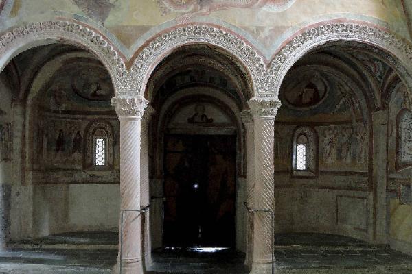- NOTIZIE STORICO CRITICHE Le diverse opinioni della critica sull'età degli stucchi della chiesa di San Pietro al Monte sono andate di pari passo con la datazione degli affreschi. Le proposte avanzate infatti sono molteplici e oscillano tra la seconda metà del XI secolo e la prima metà del secolo successivo. Anche sull'ambito di produzione i pareri sono discordi. Infatti, pur ammettendo una comune matrice lombarda, diverse sono le posizioni degli studiosi sui possibili ambiti di influenza e sui vari gradi di ricezione dei modelli. Sulla base delle diverse datazioni proposte ci si altalena fra chi è più propenso a riconoscervi soprattutto influenze derivanti dall'ambito ottoniano e chi invece ammette più che altro un predominio di cultura bizantineggiante. Opinione comune tra gli studiosi resta però l'unitarietà del programma iconologico al cui complesso significato concorrono pienamente anche gli apparati decorativi in stucco.\nAlcuni sono infatti i significati simbolici individuati dalla critica anche in questi elementi ornamentali. Per esempio il differente andamento tortile decorativo di una colonna del vestibolo, rispetto alle altre tre, è stato interpretato come una rappresentazione metaforica dei quattro evangelisti, dove si è voluto diversificare i tre sinottici, Matteo, Marco e Luca, da Giovanni. Mentre i due plutei che delimitano lo spazio dell'endonartece, tra le prime immagini viste dal fedele che varcava l'ingresso della chiesa, sono stati interpretati da taluni come raffigurazioni del male che il pellegrino, in un percorso di redenzione volto alla salvezza, era chiamato a rifuggire lasciandosele alle spalle. Altri viceversa hanno immaginato questi animali mitologici come custodi dell'edificio, con la funzione cioè di allontanare il male.