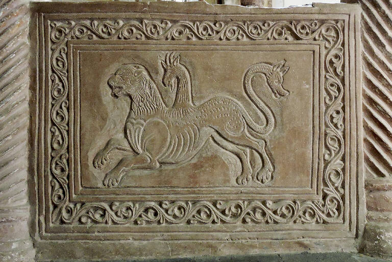 A delimitare la superficie dell'endonartece della chiesa di San Pietro al Monte, serrando lo spazio fra le colonne, sono interposti due plutei in stucco. Quello di sinistra, decorato da un fregio esterno formato da sinuosi motivi vegetali e più internamente da una doppia scanalatura lineare, raffigura una Chimera: un mostro mitologico con la testa di leone, una testa di capra sulla schiena e una testa di drago nella coda.