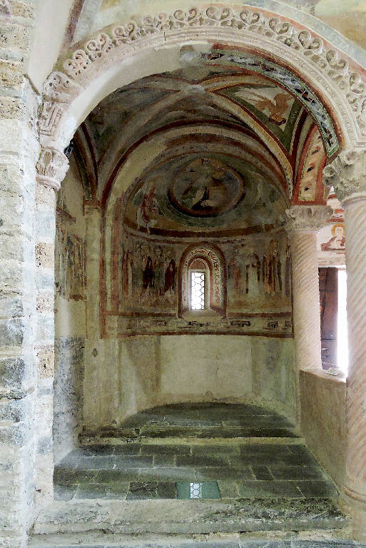 Nella campata di destra - detta Cappella dei santi - dell'endonartece della chiesa di San Pietro al Monte sono rappresentati nell'abside Cristo benedicente tra angeli e Teorie di santi, nelle vele della volta i simboli dei Quattro evangelisti e nella parete laterale il Martirio di Giacomo di Zebedeo e il Martirio di Giacomo di Alfeo.
