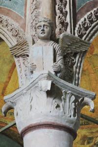 Il ciborio che sovrasta l'altare della chiesa di San Pietro al Monte s'innalza su quattro colonne con capitelli corinzi semplificati. Al di sopra di ogni capitello, in prossimità degli spigoli del fastigio, sono collocati i simboli dei Quattro evangelisti.
