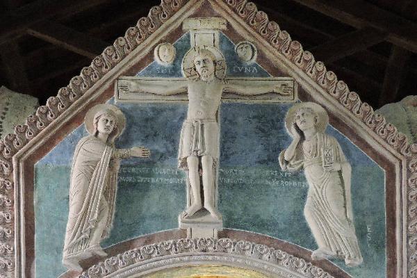 Nel timpano anteriore del fastigio del ciborio della chiesa di San Pietro al Monte è raffigurata una Crocifissione.