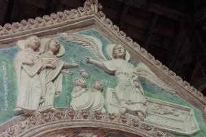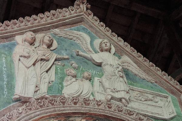 Nel timpano di destra del fastigio del ciborio della chiesa di San Pietro al Monte sono raffigurate le Pie donne al sepolcro.