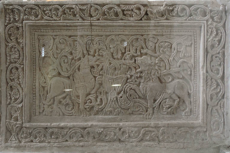 - NOTIZIE STORICO CRITICHE Come per il resto delle decorazioni in stucco e degli affreschi della chiesa di San Pietro al Monte anche per i pannelli che costituiscono la transenna della scala della cripta sono varie le opinioni avanzate dagli studiosi sulla datazione che oscilla tra la seconda metà del XI secolo e la prima metà del secolo successivo.\nQuesta ornamentazione plastica contraddistinta da un vero e proprio horror vacui è altrettanto ricca di simbologie e significati che purtroppo oggi in parte sfuggono alla nostra comprensione. Fra le ipotesi avanzate sull'interpretazione dei soggetti raffigurati una, sulla base delle differenti coppie di animali che si affrontano nei riquadri, propone di leggervi una rappresentazione dei tre stadi della vita umana: il primordiale, il profetico e di attesa della promessa e il sacramentale escatologico.